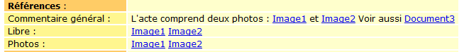 Lorsque cette case est cochée, les lien vers les images d'actes ou les liens http (zone "Cote", "Libre", "Commentaires généraux" et "Photos") n'apparaissent que lorsque le visiteur est connecté; dans le cas contraire le texte "image privée"ou "document privé" est affiché.Textes facultatifs